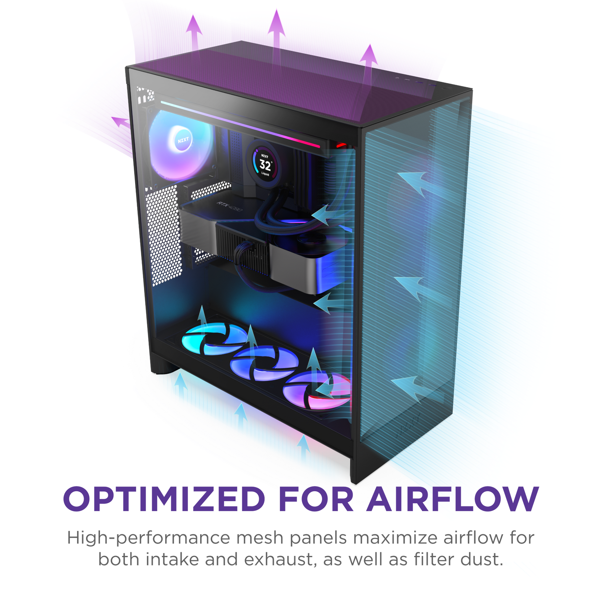 The H7 Flow RGB revolutionizes GPU cooling in a classic mid-tower form factor. Its vertical PSU layout allows space for 3 x 120mm bottom fans, offering efficient cooling without expanding the case footprint.