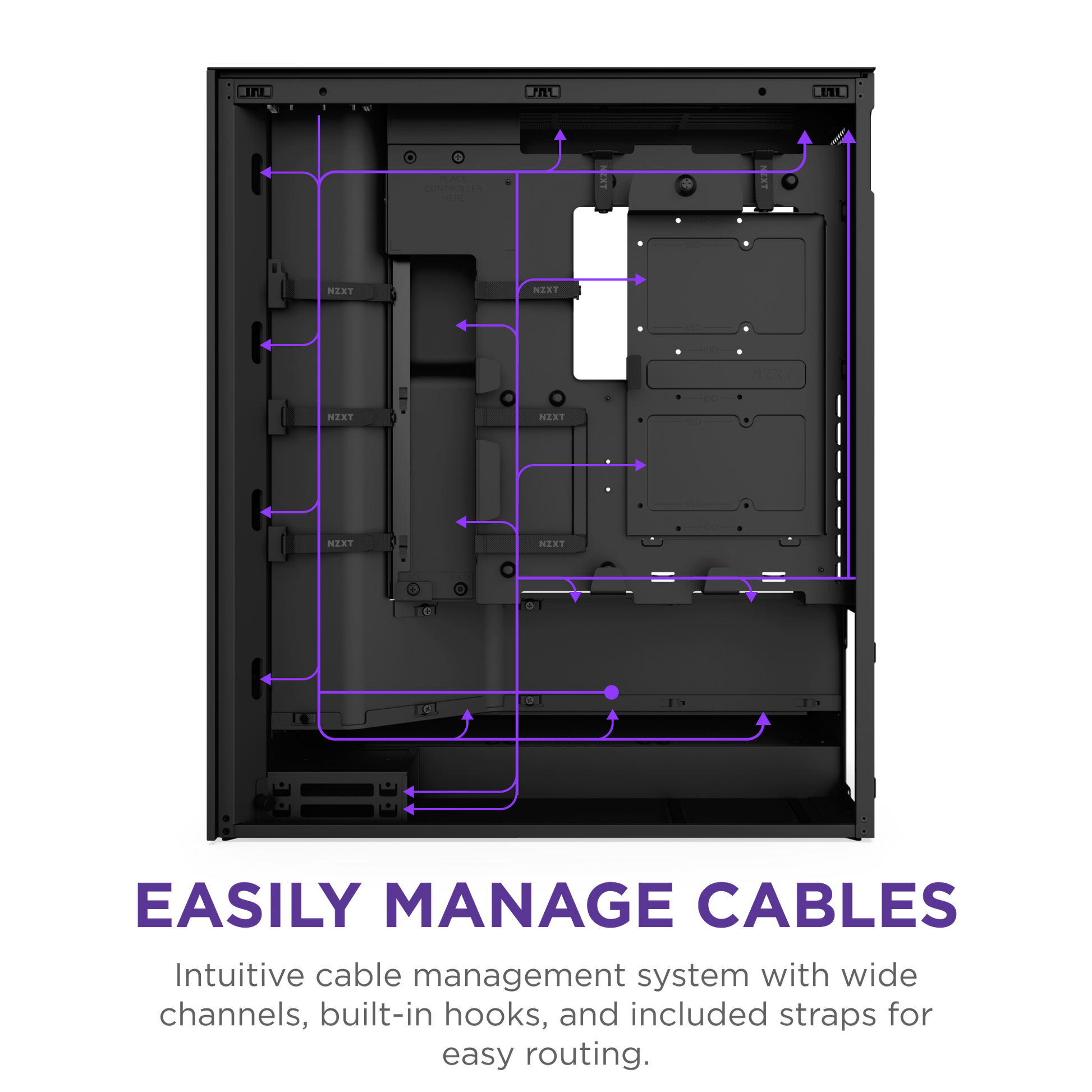 - Intuitive cable management system with wide channels, built-in hooks, and included straps for easy routing.