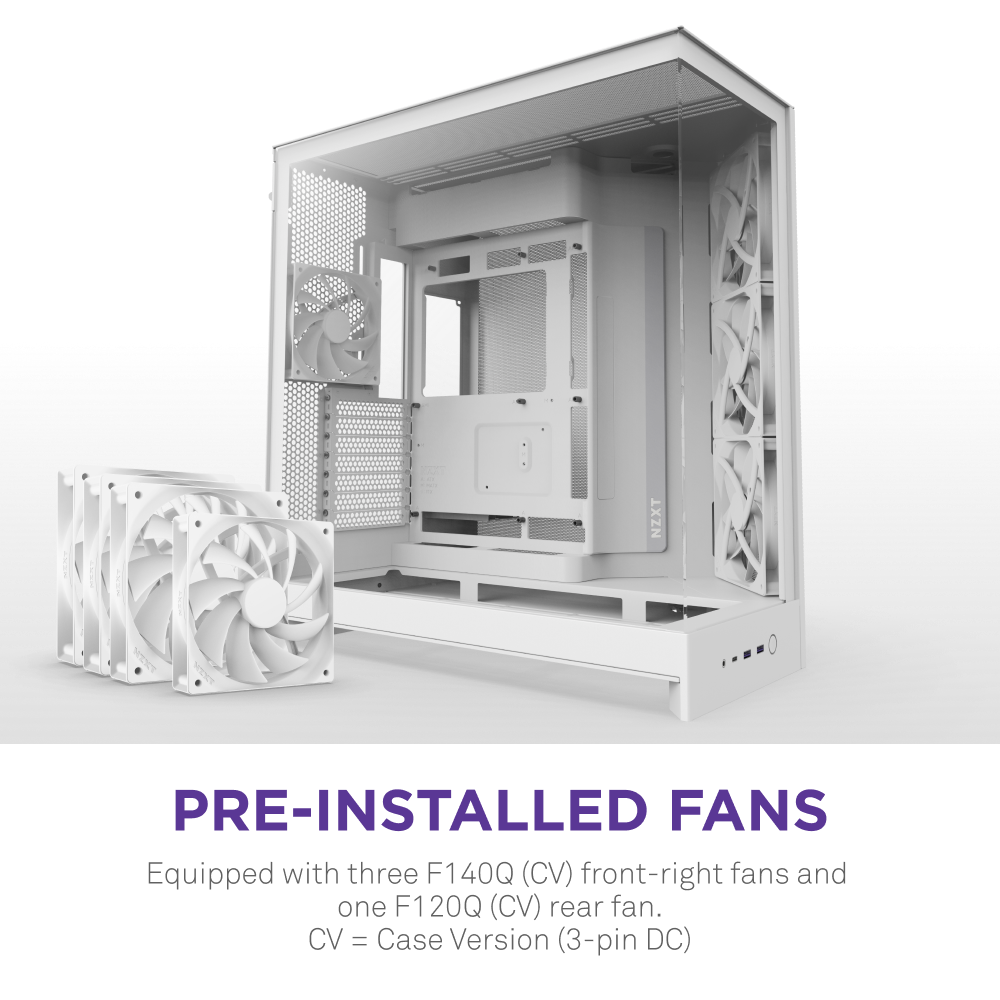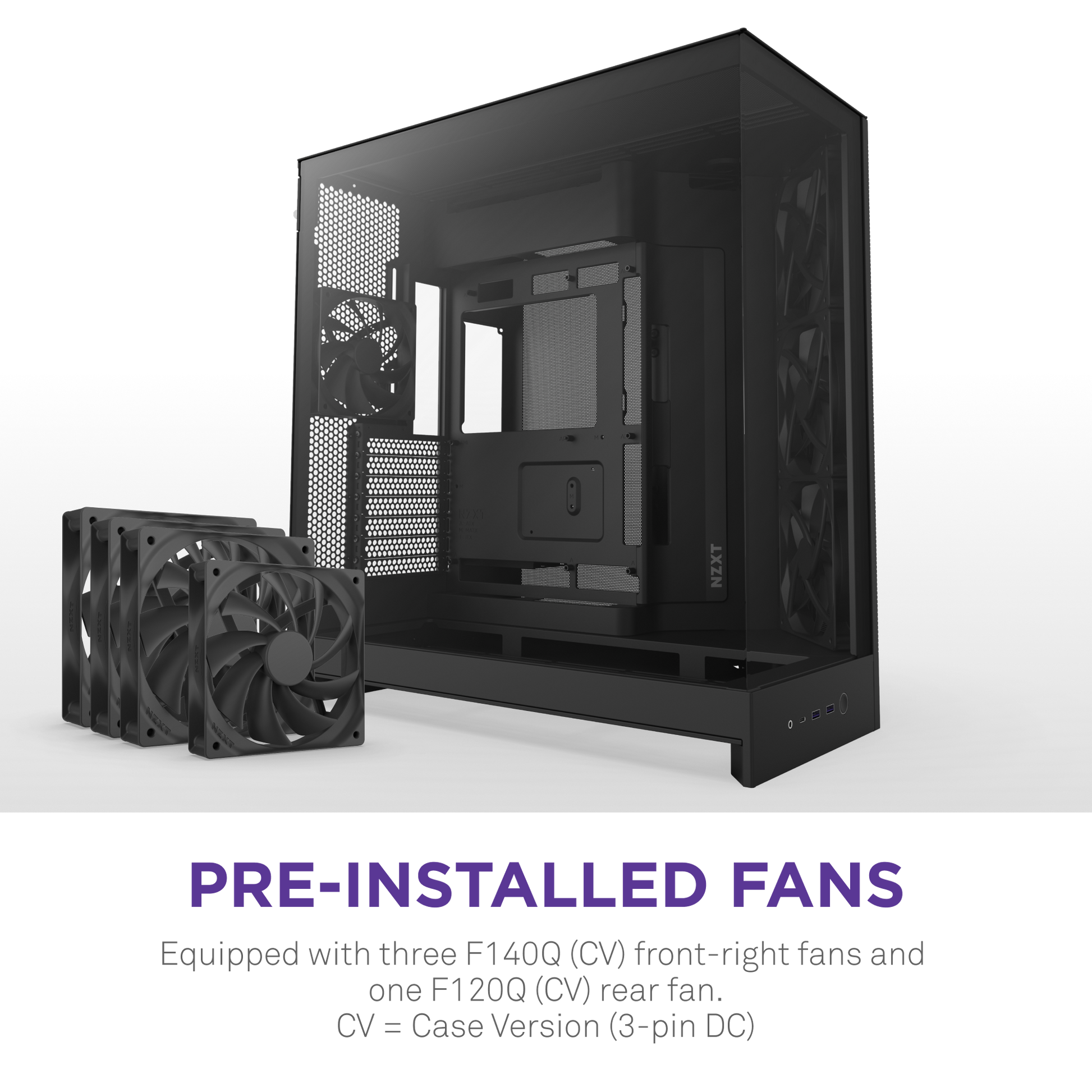 - Pre-Installed Fans: Includes three F140Q (CV) fans in the front-right and one F120Q (CV) fan in the rear. CV = Case Version (3-pin DC)