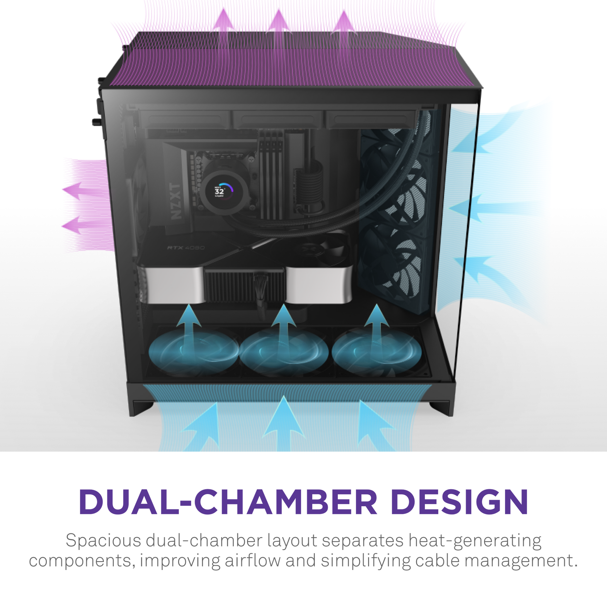 The H9 Flow is a spacious mid-tower ATX case built for high-performance builds, balancing airflow and aesthetics. Its dual-chamber design improves cooling and cable management, while perforated panels, angled fans, and ample fan and radiator support deliver optimal thermal performance.